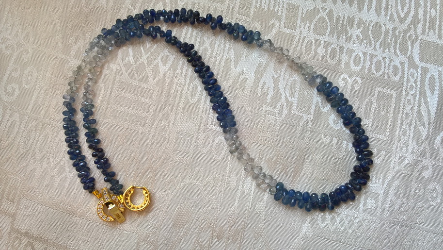 Nádherný náhrdelník z barevných přírodních safírů 3-5mm. Safíry jsou vybroušeny do tvaru kapek s mnoha ploškami, pro jiskřivou barvu. Délka 41cm.