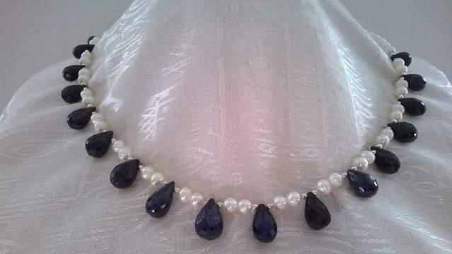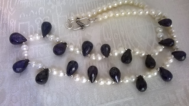 Perlový náhrdelník jezerní bílé perly a modrý křišťál