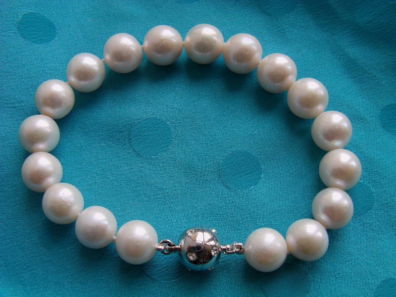 Perlový náramek navlečený na hedvábné niti, jezerní perly, velmi dobrá kvalita, krásný lesk |